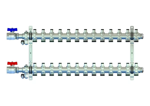 • Vorlauf- und Rücklaufbalken mit integrierten Regulierventilen mit Memoryfunktion (Kvs=2,88 m³/h)
