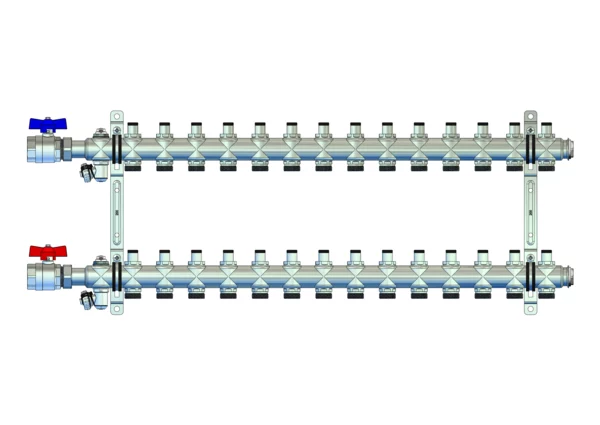 strawa HK-Anschlussverteiler e-class 55 mit SFE, mit 1''KH 14 Hkr.,BxHxT: 860x320x67 mm, 1" Kugelhahn, integr. Regulierv. im VL u RL, Spül-, Füll- und Entleerv. u Entlüftungsv. im VL + RL, Doppelw.halter 200mm m Schrauben u Dübeln