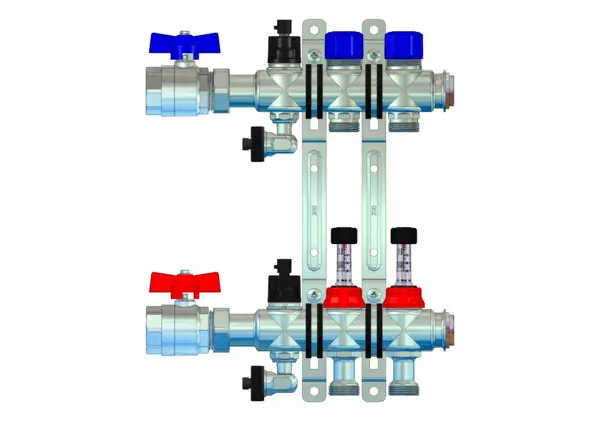 Der Anschlussverteiler für Flächenheizung und -kühlung gewährleistet einen präzisen hydraulischen Abgleich der Heizkreise durch manuell integrierte Durchflussanzeiger im Vorlaufbalken und Ventileinsätze (M30x1,5) im Rücklaufbalken. Der Primäranschluss beinhaltet eine Anschlussgarnitur ohne Wärmezählervorbereitung zum Absperren des Verteilers.