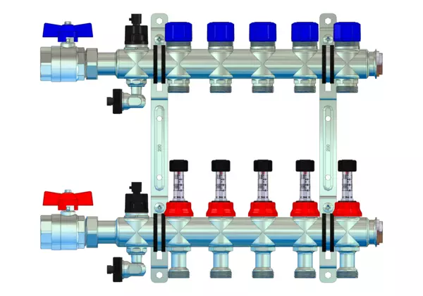 Der Anschlussverteiler für Flächenheizung und -kühlung gewährleistet einen präzisen hydraulischen Abgleich der Heizkreise durch manuell integrierte Durchflussanzeiger im Vorlaufbalken und Ventileinsätze (M30x1,5) im Rücklaufbalken. Der Primäranschluss beinhaltet eine Anschlussgarnitur ohne Wärmezählervorbereitung zum Absperren des Verteilers.