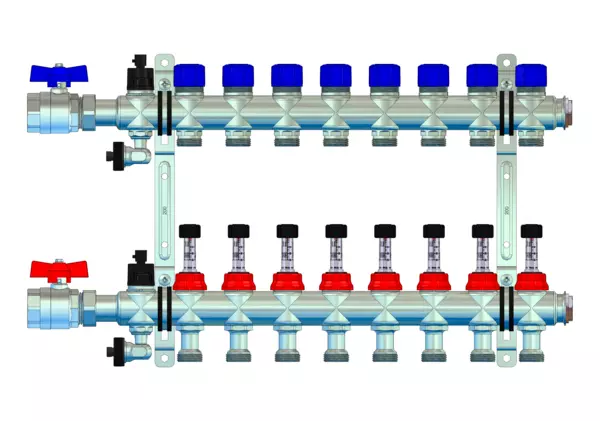 Der Anschlussverteiler für Flächenheizung und -kühlung gewährleistet einen präzisen hydraulischen Abgleich der Heizkreise durch manuell integrierte Durchflussanzeiger im Vorlaufbalken und Ventileinsätze (M30x1,5) im Rücklaufbalken. Der Primäranschluss beinhaltet eine Anschlussgarnitur ohne Wärmezählervorbereitung zum Absperren des Verteilers.