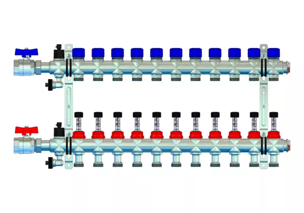 Der Anschlussverteiler für Flächenheizung und -kühlung gewährleistet einen präzisen hydraulischen Abgleich der Heizkreise durch manuell integrierte Durchflussanzeiger im Vorlaufbalken und Ventileinsätze (M30x1,5) im Rücklaufbalken. Der Primäranschluss beinhaltet eine Anschlussgarnitur ohne Wärmezählervorbereitung zum Absperren des Verteilers.