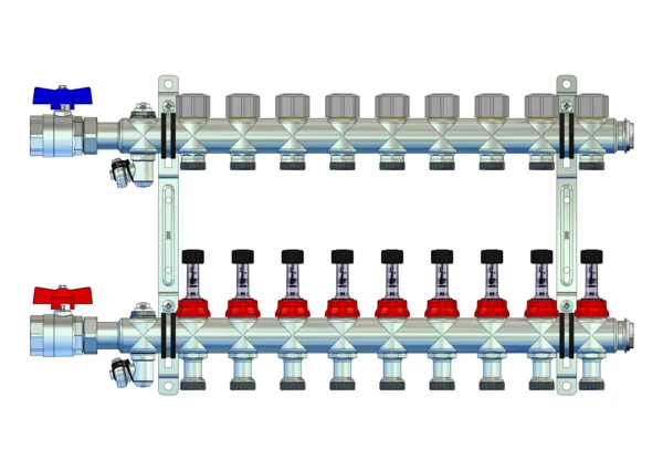 strawa FB-Anschlussverteiler e-class 87 mit SFE, mit 1''KH 9 Hkr.,BxHxT: 610 x 320 x 67 mm, 1" Kugelhahn, DFA min/max. im VL u THV m Q-Tech Durchflussregler M30x1,5 im RL, SFE-Ventil u Entlüftungsv. im VL + RL, Doppelwandhalt 200mm m Schrauben u. Dübeln