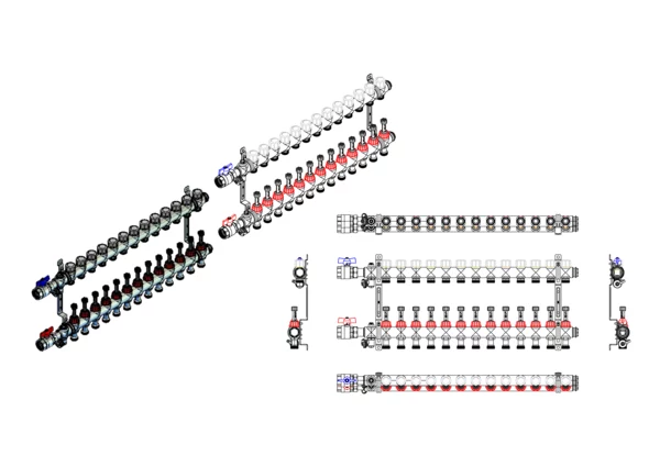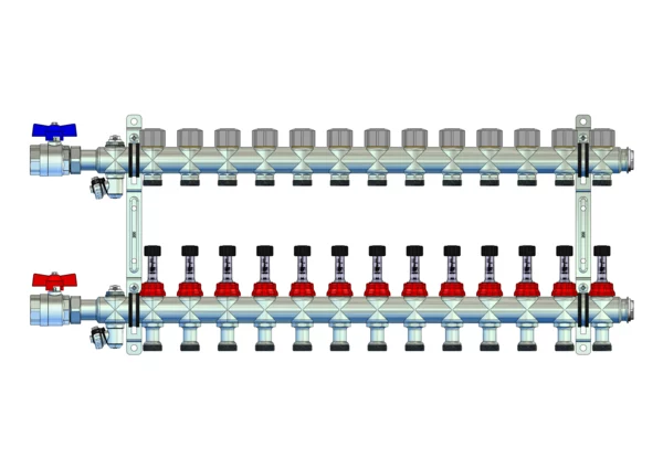 strawa FB-Anschlussverteiler e-class 87 mit SFE, mit 1''KH 13 Hkr.,BxHxT: 810x320x67 mm, 1" Kugelhahn, DFA min/max. im VL u THV m Q-Tech Durchflussregler M30x1,5 im RL, SFE-Ventil u Entlüftungsv. im VL + RL, Doppelwandhalt 200mm m Schrauben u. Dübeln
