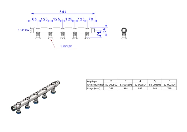Abstand zwischen den Abzweigungen 125 mm