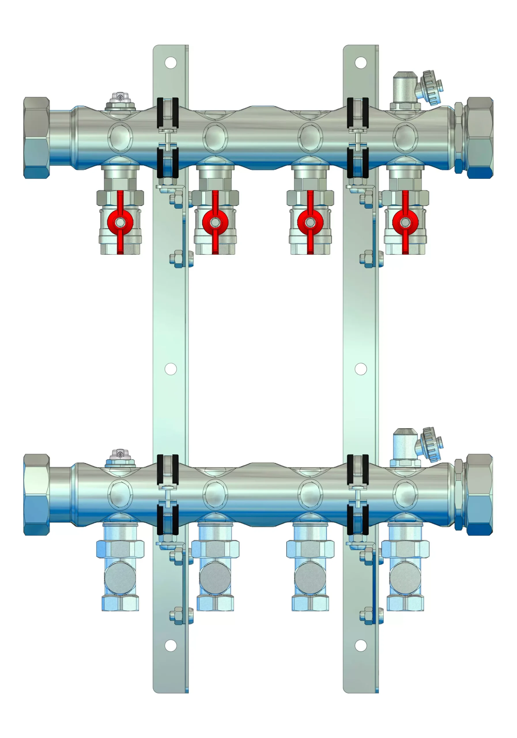 • Vorlaufbalken mit angehangene 3/4" Kugelhähne pro Heizkreis, Flügelgriff rot