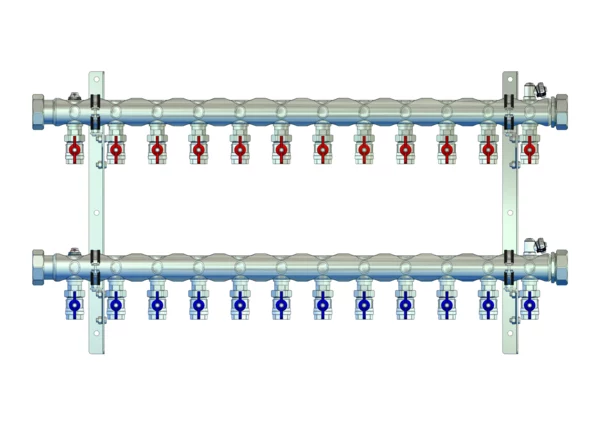 • Vorlaufbalken mit angehangene 3/4" Kugelhähne pro Heizkreis, Flügelgriff rot