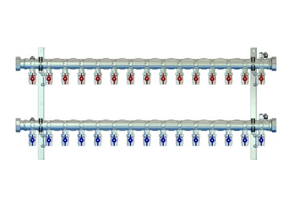 • Vorlaufbalken mit angehangene 3/4" Kugelhähne pro Heizkreis, Flügelgriff rot