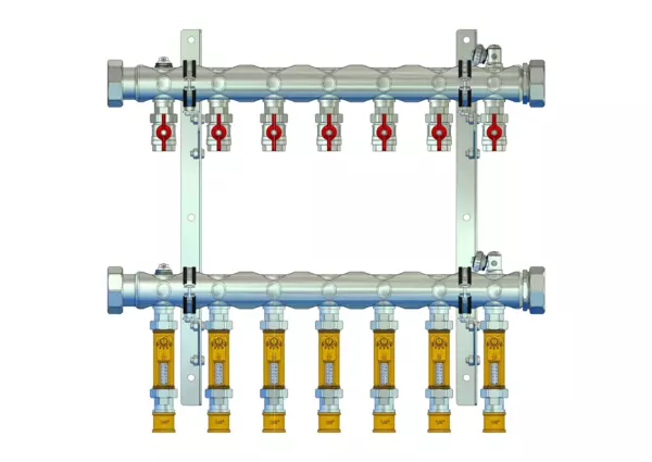 • Rücklaufbalken mit angehangene Durchflussanzeiger Tacosetter Inline 100 4-15 l/min (Kvs=5,0 m³/h), auf Anfrage 8-30 l/min bzw. 10-40 l/min) pro Heizkreis