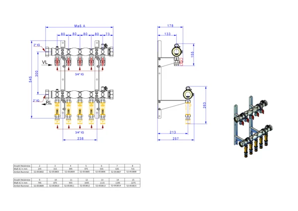 strawa Industrie- und Soleverteiler e-class 38 12 Hkr.,BxHxT: 1095 x 599 x 258 mm, 3/4"Kugelhähne im VL und Tacosetter Inline 4-15 l/min im RL, Spül-, Füll- und Entleerv. u Entlüftungsv. im VL + RL, Doppelwandhalter 300mm m. Schrauben u Dübeln