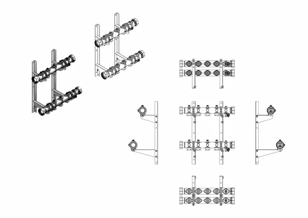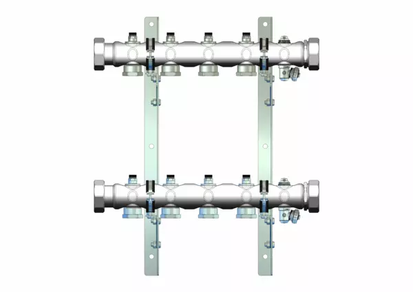 • Vorlauf- und Rücklaufbalken mit integriertem manuell einstellbarem und absperrbarem Regulierventil (Kvs=4,16 m³/h) pro Heizkreis