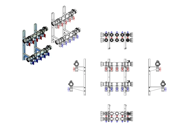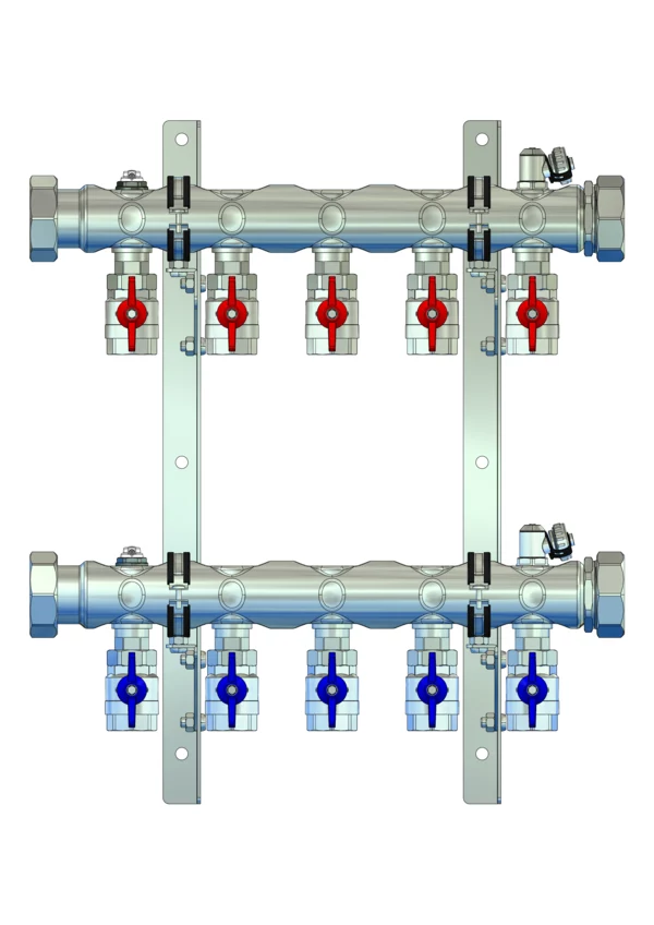 • Vorlaufbalken mit angehangene 1" Kugelhähne pro Heizkreis, Flügelgriff rot