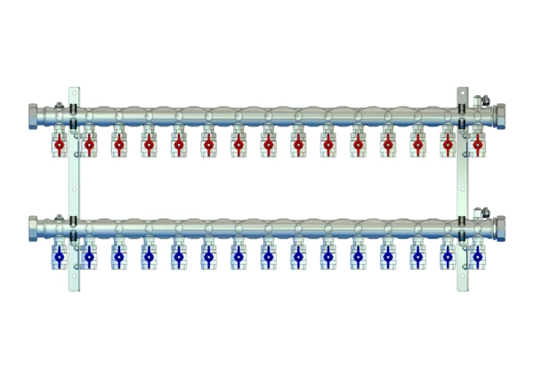 strawa Industrie- und Soleverteiler e-class 37-1'' 15 Hkr.,BxHxT: 1335x545x258 mm, 1"Kugelhähne im VL und RL, Spül-, Füll- und Entleerv. u Entlüftungsv. im VL + RL, Doppelwandhalter 300mm m. Schrauben u Dübeln