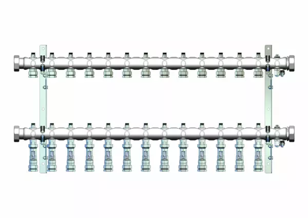 • Rücklaufbalken mit integriertem manuell einstellbarem und absperrbarem Regulierventil (Kvs=4,16 m³/h) und angehangenem Durchflussanzeiger 4-15 l/min (auf Anfrage 10-40 l/min) pro Heizkreis