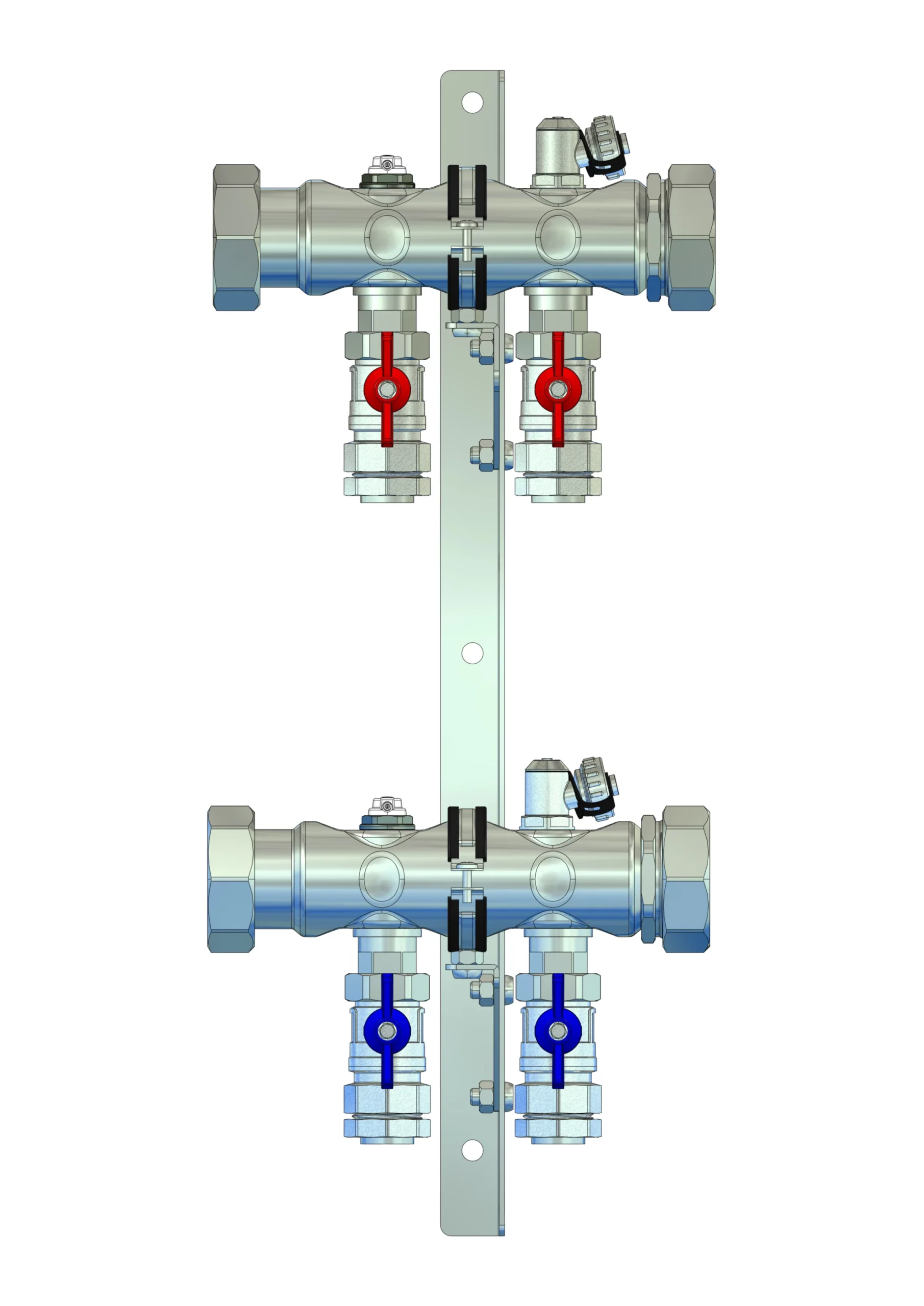 Kugelhähne mit Klemmverschraubung 25 mm im Vor- und Rücklaufbalken, Spül-, Füll- und Entleerventil und Entlüftungsventil im Vor- und Rücklaufbalken, Doppelwandhalter 300mm mit Schrauben u Dübeln