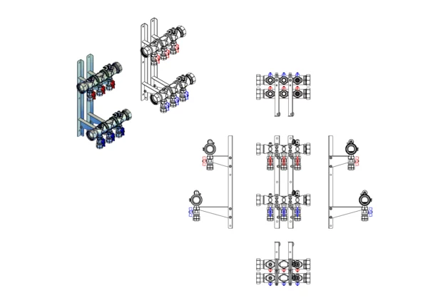 Kugelhähne mit Klemmverschraubung 25 mm im Vor- und Rücklaufbalken, Spül-, Füll- und Entleerventil und Entlüftungsventil im Vor- und Rücklaufbalken, Doppelwandhalter 300mm mit Schrauben u Dübeln
