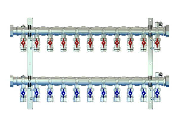 • Vorlaufbalken mit angehangene 3/4" Kugelhähne pro Heizkreis, Flügelgriff rot,