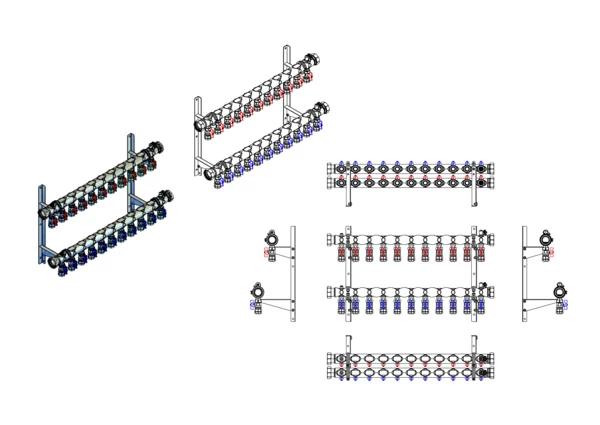 • Rücklaufbalken mit angehangene 3/4" Kugelhähne pro Heizkreis, Flügelgriff blau