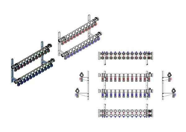 Kugelhähne mit Klemmverschraubung 25 mm im Vor- und Rücklaufbalken, Spül-, Füll- und Entleerventil und Entlüftungsventil im Vor- und Rücklaufbalken, Doppelwandhalter 300mm mit Schrauben u Dübeln
