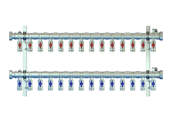 • Vorlaufbalken mit angehangene 3/4" Kugelhähne pro Heizkreis, Flügelgriff rot,