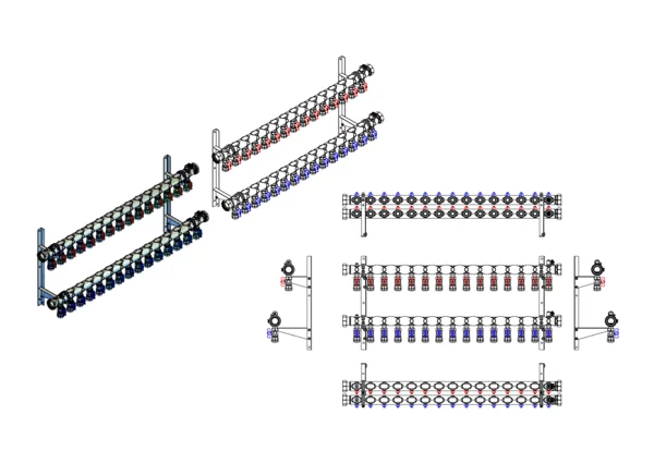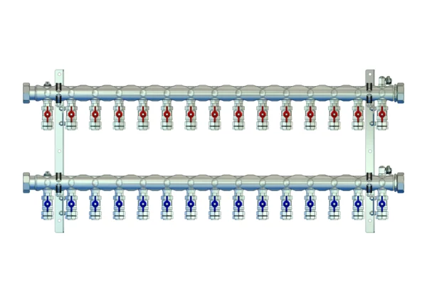 • Vorlaufbalken mit angehangene 3/4" Kugelhähne pro Heizkreis, Flügelgriff rot,