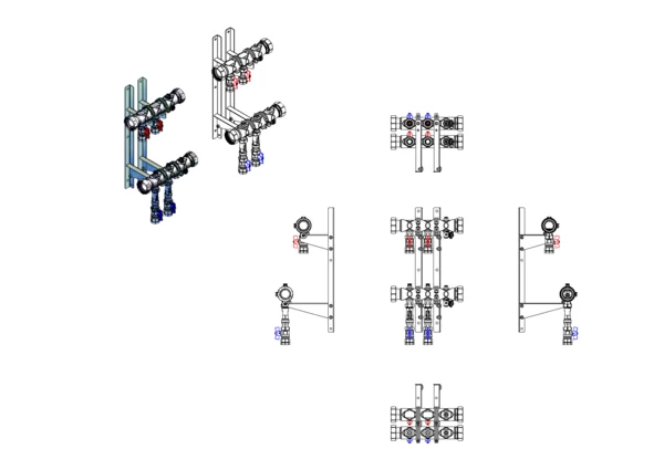 Kugelhähne mit Klemmverschraubung 25 mm im Vor- und Rücklaufbalken, Durchlussanzeiger 4-15 l/min und integrierte Regulierventile im Rücklaufbalken, Spül-, Füll- und Entleerventil im Vor- und Rücklaufbalken, Doppelwandhalter 300mm