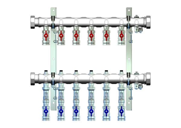 Der Anschlussverteiler für Flächenheizung, -kühlung und Soleanwendungen ermöglicht einen präzisen hydraulischen Abgleich der Heizkreise durch integrierte Regulierventile pro Heizkreis. Jeder Heizkreis ist mit einem Durchflussanzeiger und Klemmverschraubungen ausgestattet.