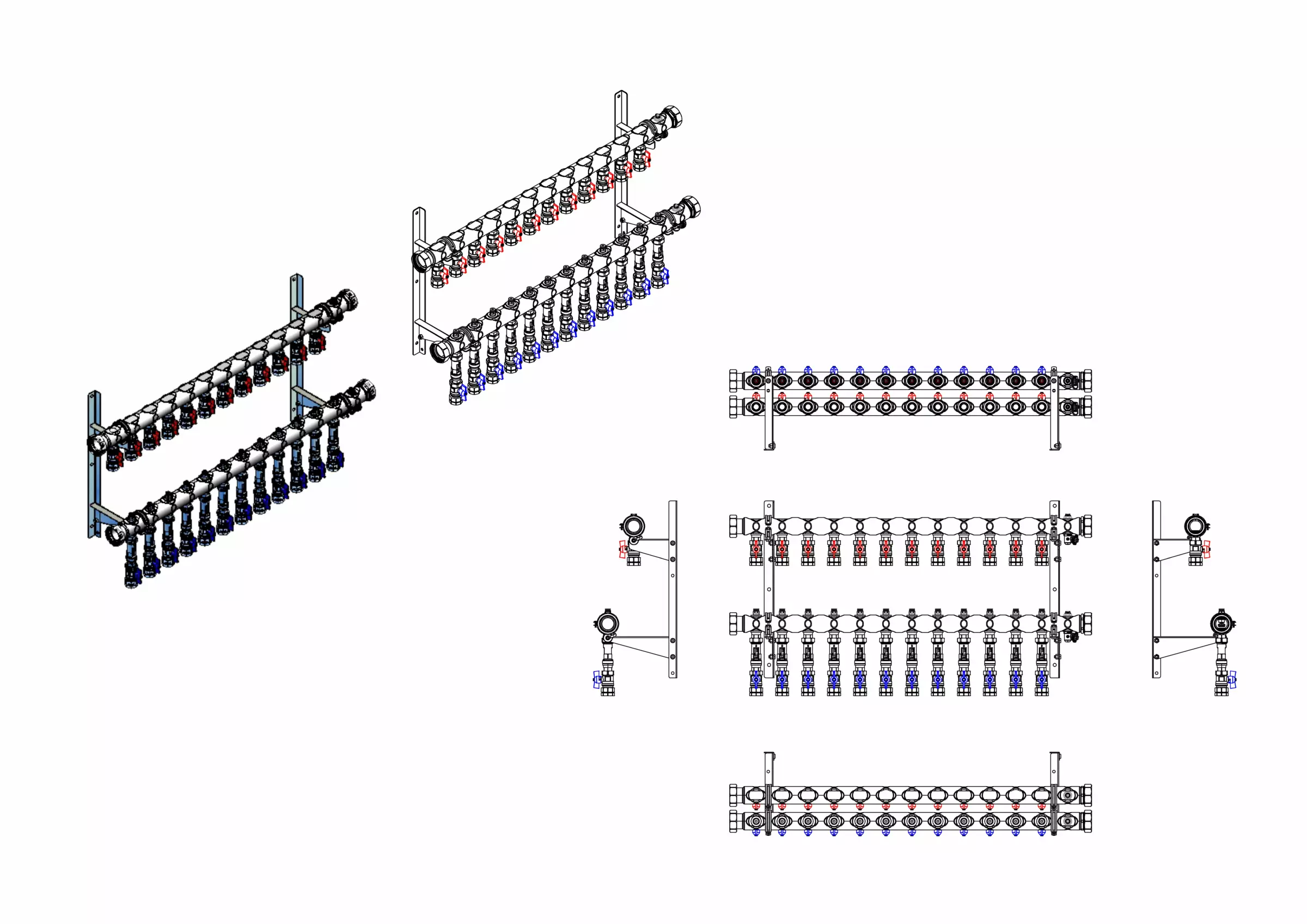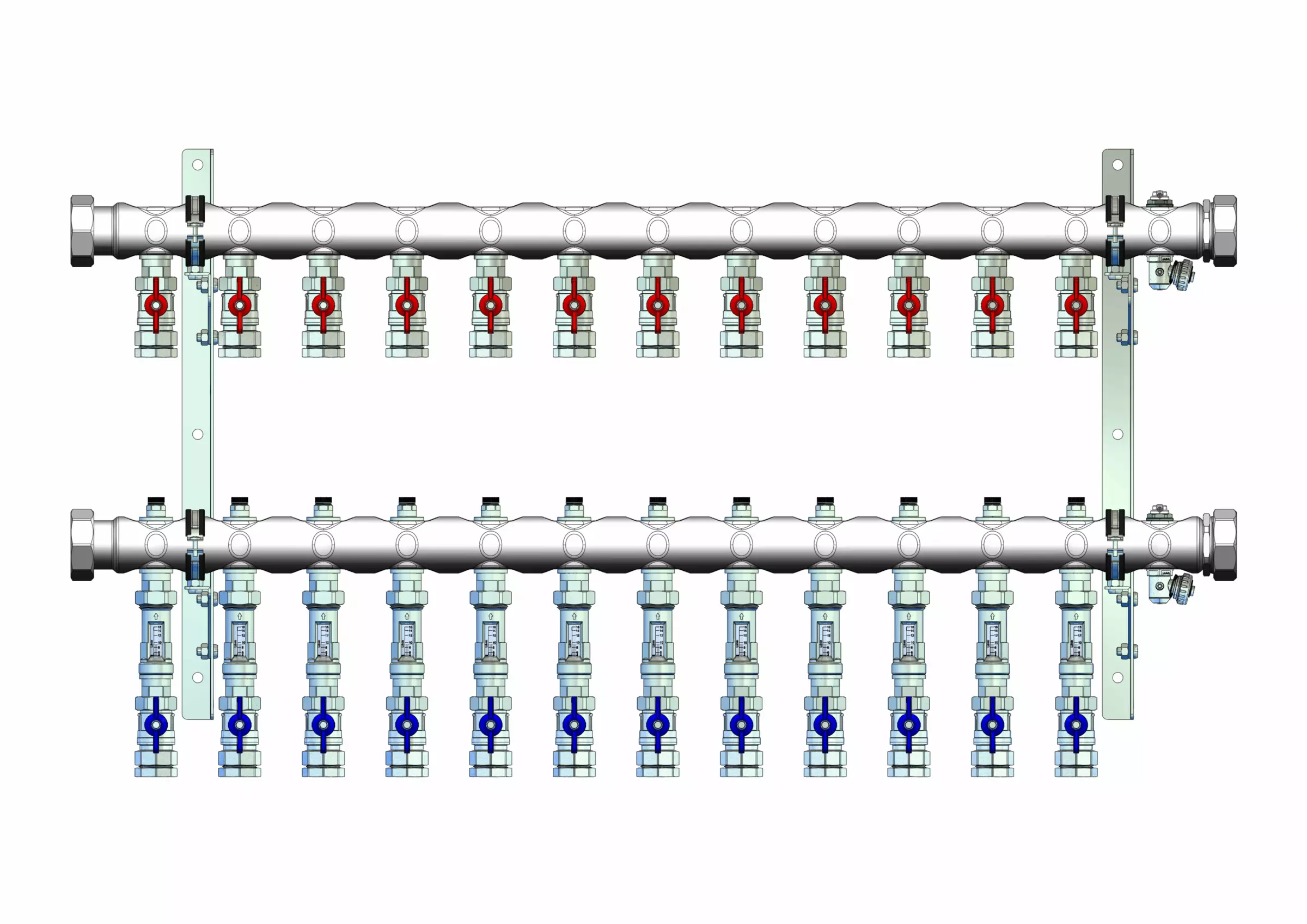 Kugelhähne mit Klemmverschraubung 25 mm im Vor- und Rücklaufbalken, Durchlussanzeiger 4-15 l/min und integrierte Regulierventile im Rücklaufbalken, Spül-, Füll- und Entleerventil im Vor- und Rücklaufbalken, Doppelwandhalter 300mm