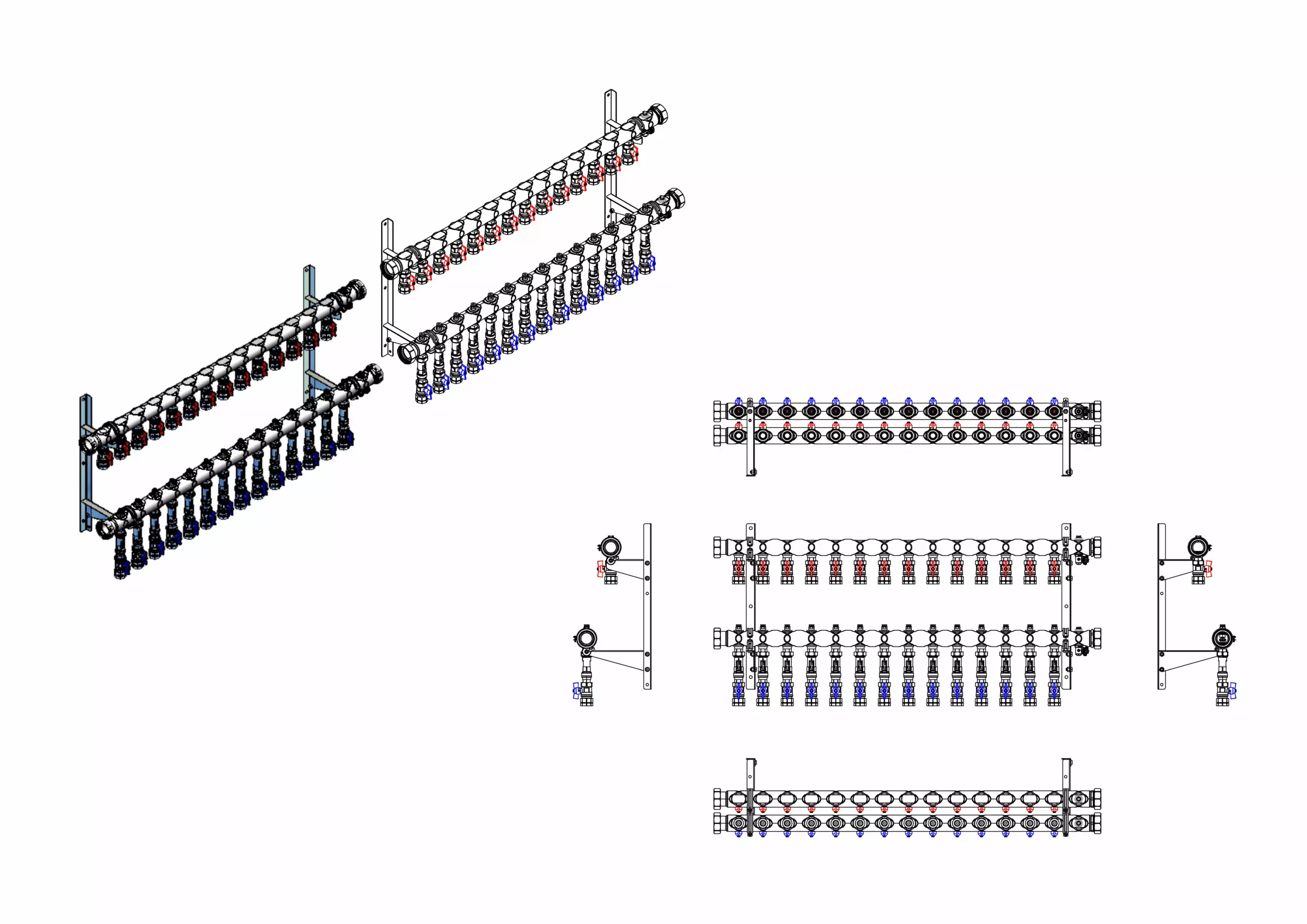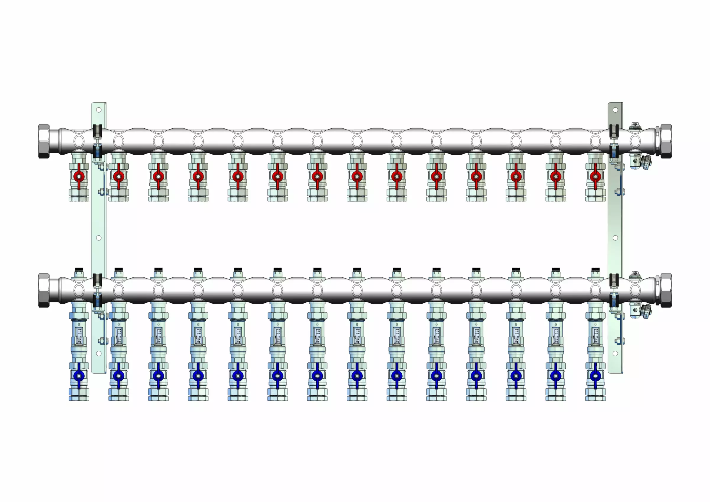 Kugelhähne mit Klemmverschraubung 25 mm im Vor- und Rücklaufbalken, Durchlussanzeiger 4-15 l/min und integrierte Regulierventile im Rücklaufbalken, Spül-, Füll- und Entleerventil im Vor- und Rücklaufbalken, Doppelwandhalter 300mm