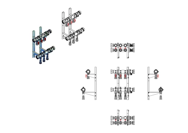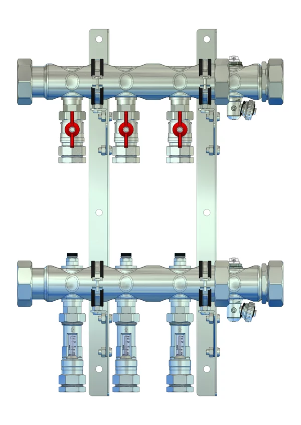 Kugelhähne mit Klemmverschraubung 25 mm im Vorlaufbalken, Durchlussanzeiger 4-15 l/min, integrierte Regulierventile und Klemmverchraubungen 25 mm im Rücklaufbalken, Spül-, Füll- und Entleerventil im Vor- und Rücklaufbalken, Doppelwandhalter 300mm