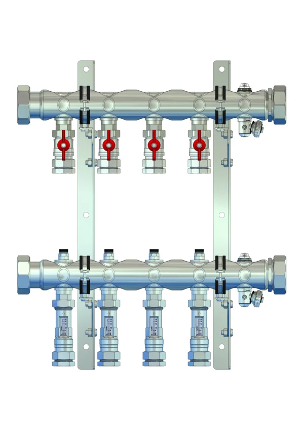 • Rücklaufbalken mit angehangene Durchflussanzeigern 4-15 l/min (auf Anfrage 10-40 l/min), integrierte einstellbare und abstellbare Regulierventile (Kvs=4,16 m³/h) pro Heizkreis