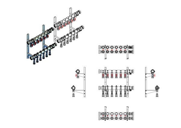 Kugelhähne mit Klemmverschraubung 25 mm im Vorlaufbalken, Durchlussanzeiger 4-15 l/min, integrierte Regulierventile und Klemmverchraubungen 25 mm im Rücklaufbalken, Spül-, Füll- und Entleerventil im Vor- und Rücklaufbalken, Doppelwandhalter 300mm