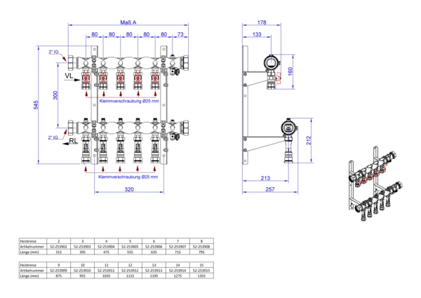 strawa Industrie- und Soleverteiler e-class 39-KLV 25 7 Hkr.,BxHxT: 695 x 545 x 258 mm, Kugelhähne mit Klemmverschraubung 25 mm im VL, Durchlussanzeiger, integr. Reg.ventile u. Klemmverchraubung 25 mm im RL, SFE-Ventil. im VL + RL, Doppelwandh. 300mm