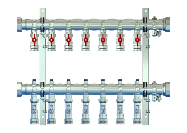 • Vorlaufbalken mit angehangenen 3/4" Kugelhähne (Flügelgriff rot) pro Heizkreis
