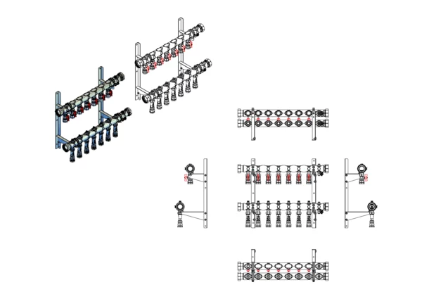 • Rücklaufbalken mit angehangene Durchflussanzeigern 4-15 l/min (auf Anfrage 10-40 l/min), integrierte einstellbare und abstellbare Regulierventile (Kvs=4,16 m³/h) pro Heizkreis