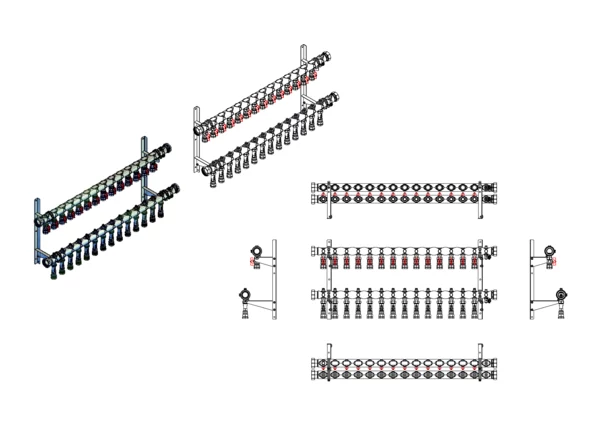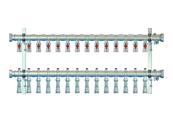 Kugelhähne mit Klemmverschraubung 25 mm im Vorlaufbalken, Durchlussanzeiger 4-15 l/min, integrierte Regulierventile und Klemmverchraubungen 25 mm im Rücklaufbalken, Spül-, Füll- und Entleerventil im Vor- und Rücklaufbalken, Doppelwandhalter 300mm