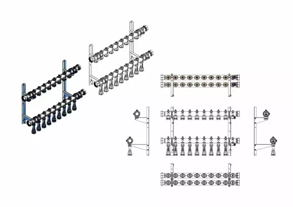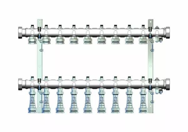 Durchflussanzeiger 4-15 l/min im Rücklaufbalken, integrierte Regulierventile, Füll- und Entleerventil, Entlüftungsventil und Klemmverschraubungen 32 mm im Vor- und Rücklaufbalken, Doppelwandhalter 300mm