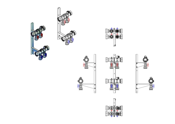 Kugelhähne mit Klemmverschraubung 32 mm im Vor- und Rücklaufbalken, Spül-, Füll- und Entleerventil und Entlüftungsventil im Vor- und Rücklaufbalken, Doppelwandhalter 300mm mit Schrauben u Dübeln