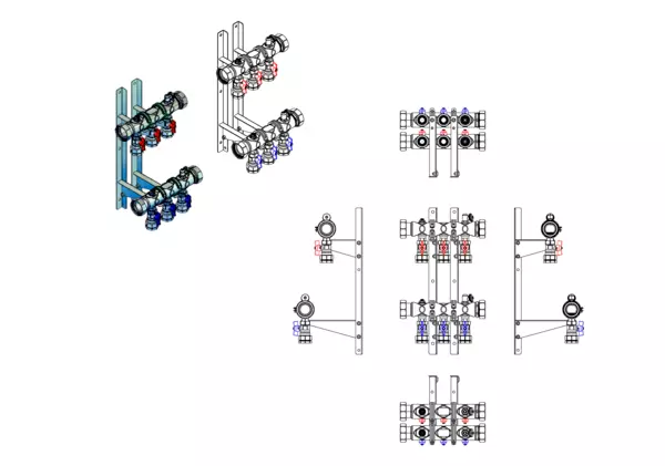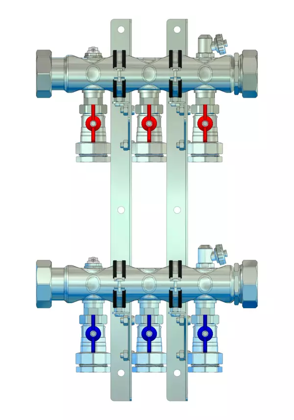 • Vorlaufbalken mit angehangene 3/4" Kugelhähne pro Heizkreis, Flügelgriff rot