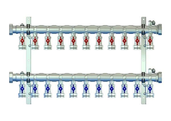Der Anschlussverteiler ist für Flächenheizungs- und -kühlungssysteme sowie Soleanwendungen konzipiert. Er ermöglicht das Absperren der Heizkreise sowohl im Vor- als auch im Rücklauf. Jeder Heizkreis ist mit Klemmverschraubungen ausgestattet.