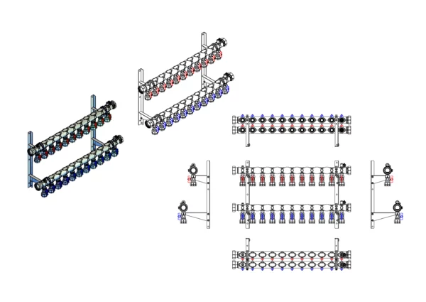 Kugelhähne mit Klemmverschraubung 32 mm im Vor- und Rücklaufbalken, Spül-, Füll- und Entleerventil und Entlüftungsventil im Vor- und Rücklaufbalken, Doppelwandhalter 300mm mit Schrauben u Dübeln