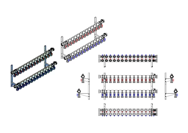 Kugelhähne mit Klemmverschraubung 32 mm im Vor- und Rücklaufbalken, Spül-, Füll- und Entleerventil und Entlüftungsventil im Vor- und Rücklaufbalken, Doppelwandhalter 300mm mit Schrauben u Dübeln