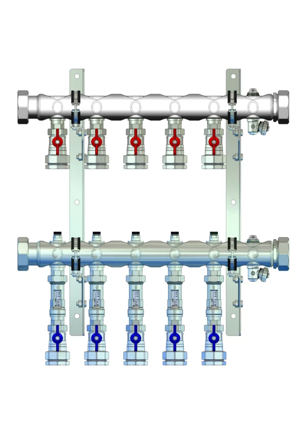 Der Anschlussverteiler für Flächenheizung, -kühlung und Soleanwendungen gewährleistet einen präzisen hydraulischen Abgleich der Heizkreise über ein integriertes Regulierventil und Durchflussanzeiger pro Heizkreis. Jeder Heizkreis ist mit angehangenen Klemmverschraubungen ausgestattet.