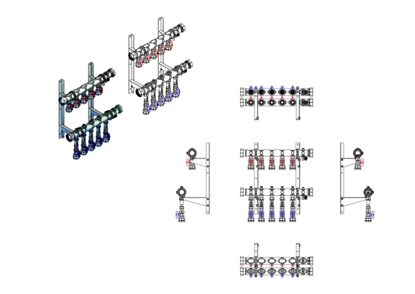 Kugelhähne mit Klemmverschraubung 32 mm im Vor- und Rücklaufbalken, Durchlussanzeiger 4-15 l/min und integrierte Regulierventile im Rücklaufbalken, Spül-, Füll- und Entleerventil im Vor- und Rücklaufbalken, Doppelwandhalter 300mm