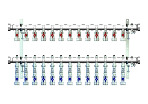 Kugelhähne mit Klemmverschraubung 32 mm im Vor- und Rücklaufbalken, Durchlussanzeiger 4-15 l/min und integrierte Regulierventile im Rücklaufbalken, Spül-, Füll- und Entleerventil im Vor- und Rücklaufbalken, Doppelwandhalter 300mm