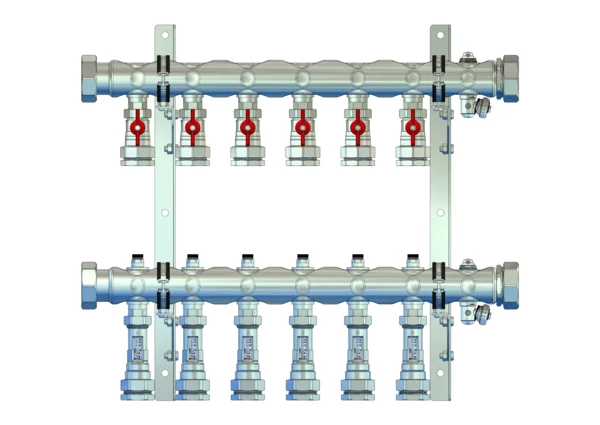 Der Anschlussverteiler für Flächenheizungs- und -kühlungssysteme sowie Soleanwendungen gewährleistet den hydraulischen Abgleich der Heizkreise durch ein integriertes Regulierventil pro Heizkreis. Er ist ausgestattet mit Durchflussanzeigern und Klemmverschraubungen für jeden Heizkreis.