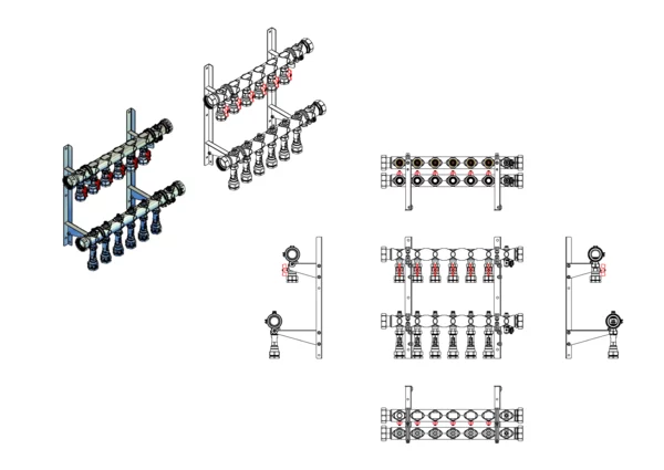 Kugelhähne mit Klemmverschraubung 32 mm im Vorlaufbalken, Durchlussanzeiger 4-15 l/min, integrierte Regulierventile und Klemmverchraubungen 32 mm im Rücklaufbalken, Spül-, Füll- und Entleerventil im Vor- und Rücklaufbalken, Doppelwandhalter 300mm