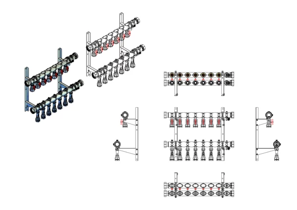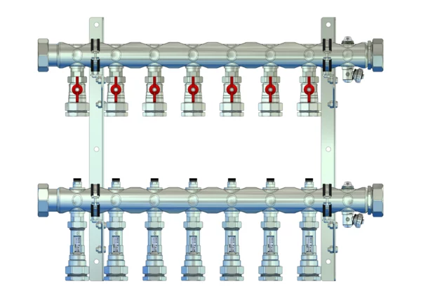 Der Anschlussverteiler für Flächenheizungs- und -kühlungssysteme sowie Soleanwendungen gewährleistet den hydraulischen Abgleich der Heizkreise durch ein integriertes Regulierventil pro Heizkreis. Er ist ausgestattet mit Durchflussanzeigern und Klemmverschraubungen für jeden Heizkreis.