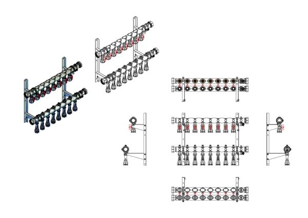 Kugelhähne mit Klemmverschraubung 32 mm im Vorlaufbalken, Durchlussanzeiger 4-15 l/min, integrierte Regulierventile und Klemmverchraubungen 32 mm im Rücklaufbalken, Spül-, Füll- und Entleerventil im Vor- und Rücklaufbalken, Doppelwandhalter 300mm