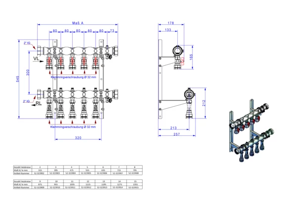 strawa Industrie- und Soleverteiler e-class 39-KLV 32 11 Hkr.,BxHxT: 1015 x 545 x 258 mm, Kugelhähne mit Klemmverschraubung 32 mm im VL, Durchlussanzeiger, integr. Reg.ventile u. Klemmverchraubung 32 mm im RL, SFE-Ventil. im VL + RL, Doppelwandh. 300mm